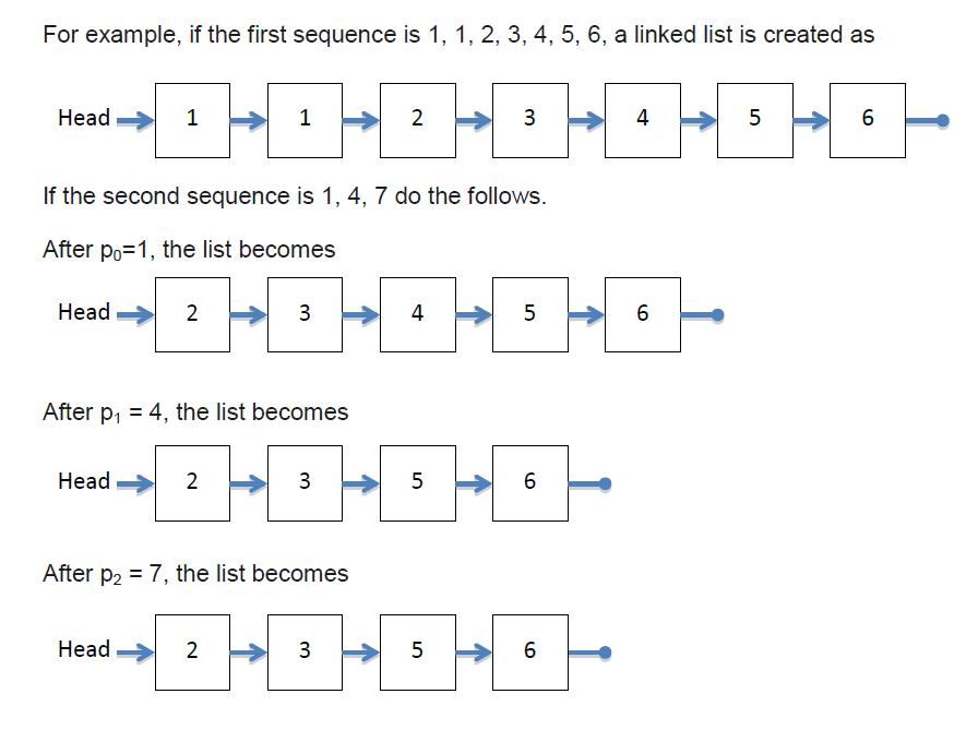 This problem will give you a sequence of positive integers. Use this sequence to create a linked list to store those integers. Next, the problem will give you another sequence of positive integers, p0, p1,…pk-1. Delete the nodes that the data is equal to one of p0, p1, …pk-1 of the linked list. If the node is not existing,do nothing. And show the final results.