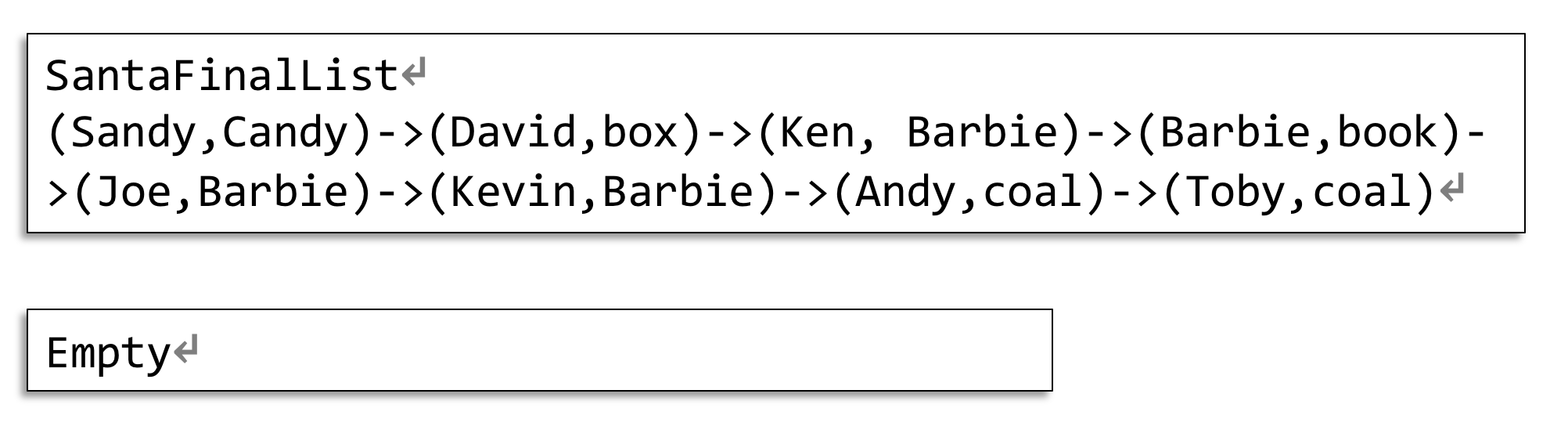 ◦ Only naughty kids will get "coal". (In other words, "coal" will not appear in SantaList and AppendList)