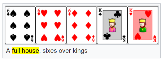 Definition of ful house: A poker hand contains three cards of one rank and two cards of another rank.