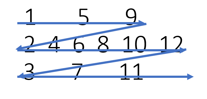 In the end, you should output this sequence in order like 1 5 9 2 4 6 8 10 12 3 7 11 .