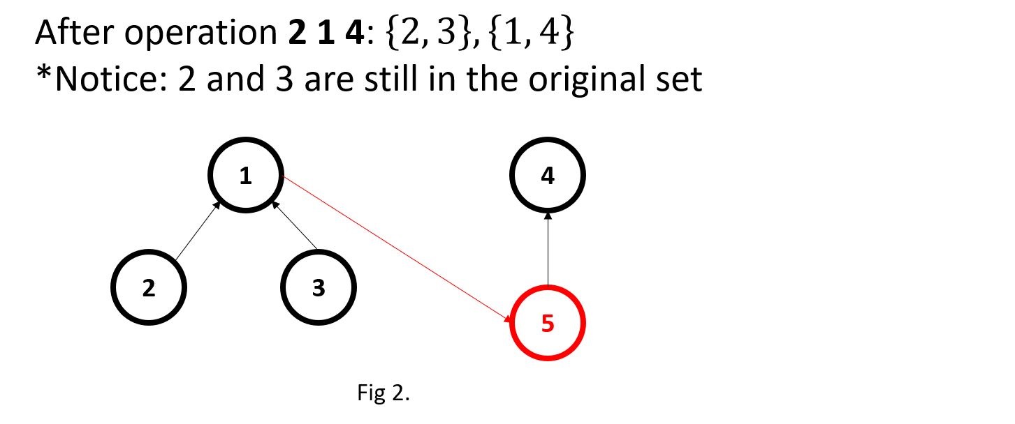 After operation 1 1 2: {1, 2}, {3}, {4}, {5}