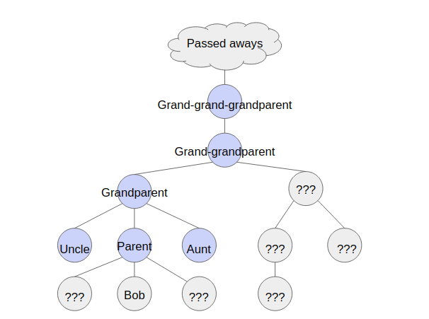 However, only his parents, uncles (disregard uncle-in-law), aunts (disregard aunt-in-law), grandparents, grand-grandparents, grand-...-grandparents will give him one red envelope in New Year's Eve (circled in the family tree), so the family tree he cares looks like the following graph. Bob calls this version of family tree "New Year Family Tree". (Relatives in blue nodes are those who will give Bob red envelopes)