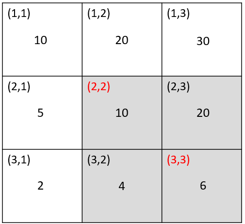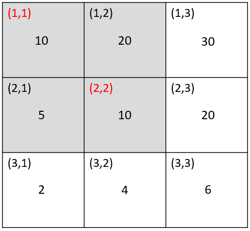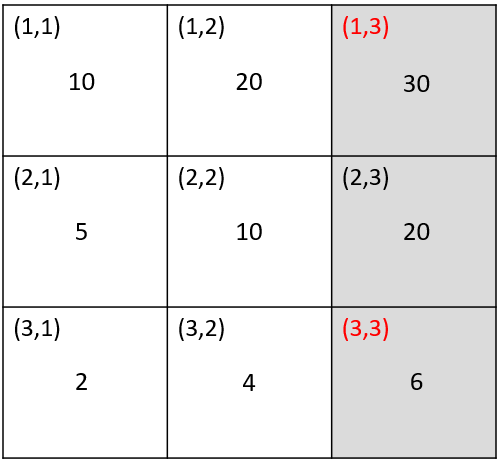 ex3: (1,3) (3,3) ==> the valuation of land is 30 + 20 + 6 = 56