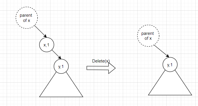 Supposing Node x with amount == 1 is to be deleted, three possible sub-cases should be considered: