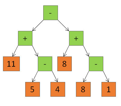 The input contains a sequences of prefix expression. It contains operators, ‘+’ and ‘-’,and positive integers separated by a space. Expression is ended by 0. (0 is not the element.)