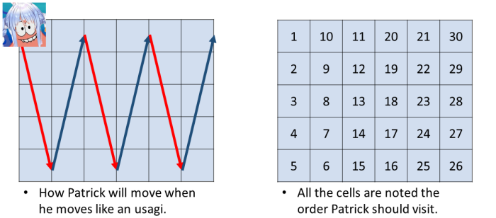 What you have to do is to offer a map. And there must be a n x m grid on the map and all the cells in the grid are noted the order Patrick should visit. In this way Patrick can move like an usagi by following your map(don’t worry about Patrick’s counting ability).