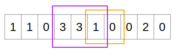 For the first query (see orange range), in range [5, 6] there is one bacteria of species 1 and one bacteria of species 0. Since there are two kind of species, output 2. For the second query (see purple range), in range [3, 5] there are two bacteria of species 3 and one bacteria of species 1. Since there are two kind of species, output 2.