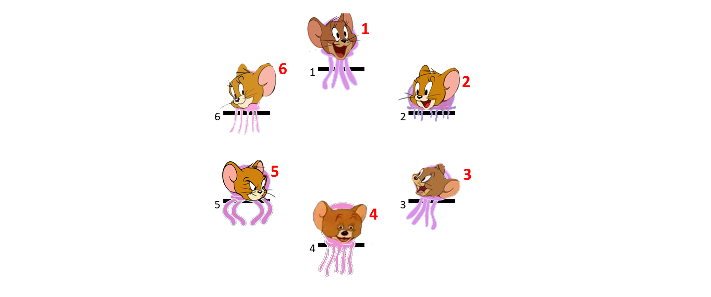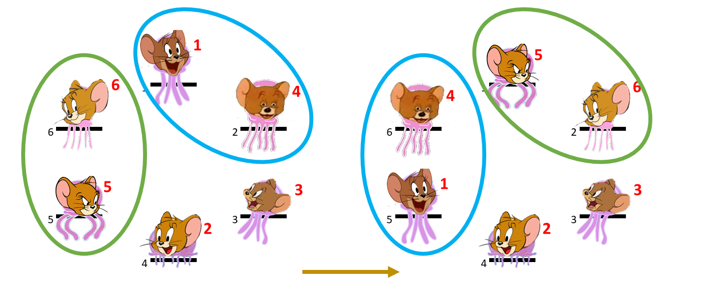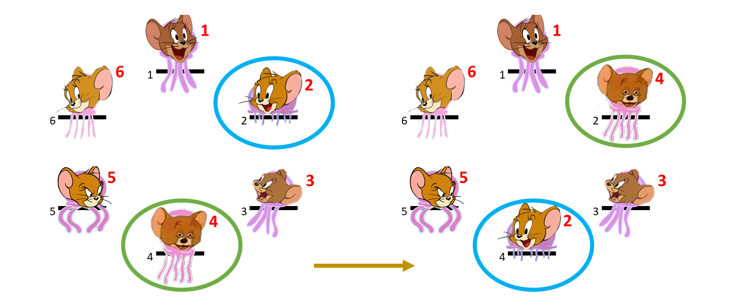 The second event: the 1st and the 2nd JerryFish exchange their postion with the 5th and the 6th JerryFish.
