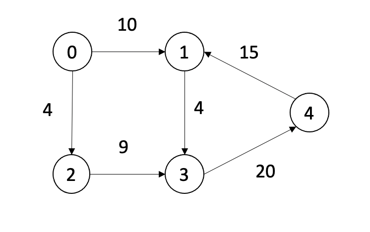 In the matrix, 0 means that there are no edges between the two nodes. Namely, the packages can not be delivered between the two nodes. Non-zero digit in the matrix means there is a directed edges between the two nodes, and the value of the digit means the cost.