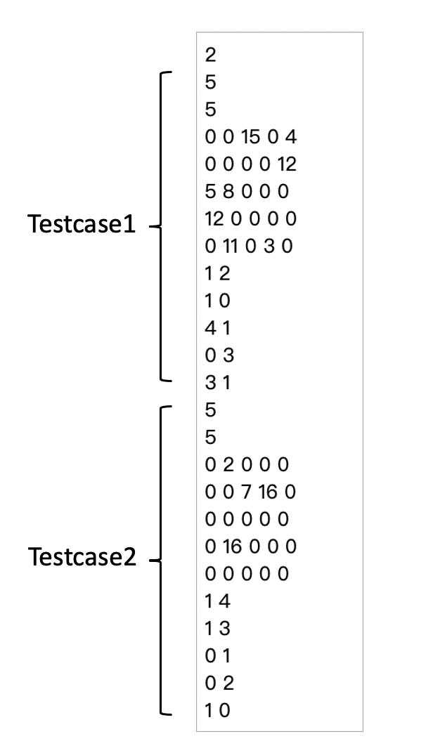For each testcase, the first line contain a number N(5<=N<=100), which means the number of nodes (logistic centers) in the route map.