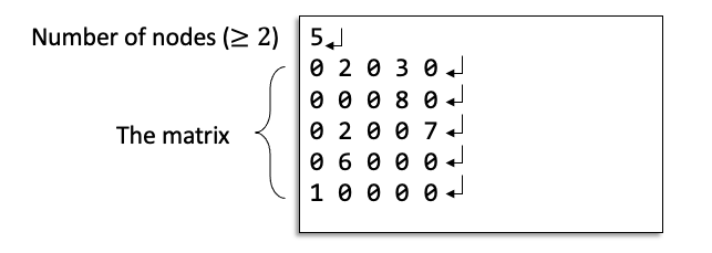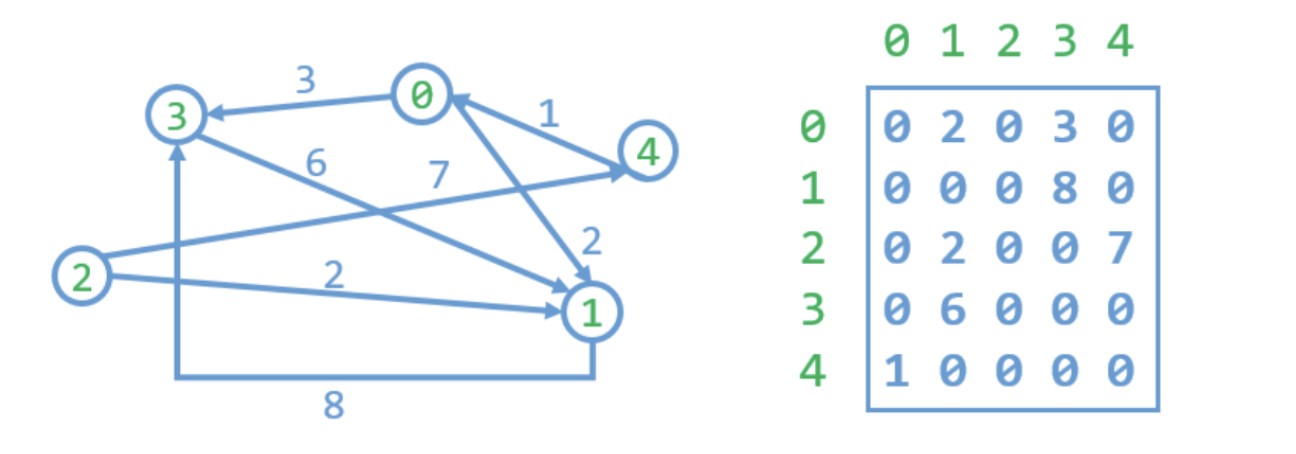 - Non-zero digits in the matrix represent the weights of the edge between nodes.