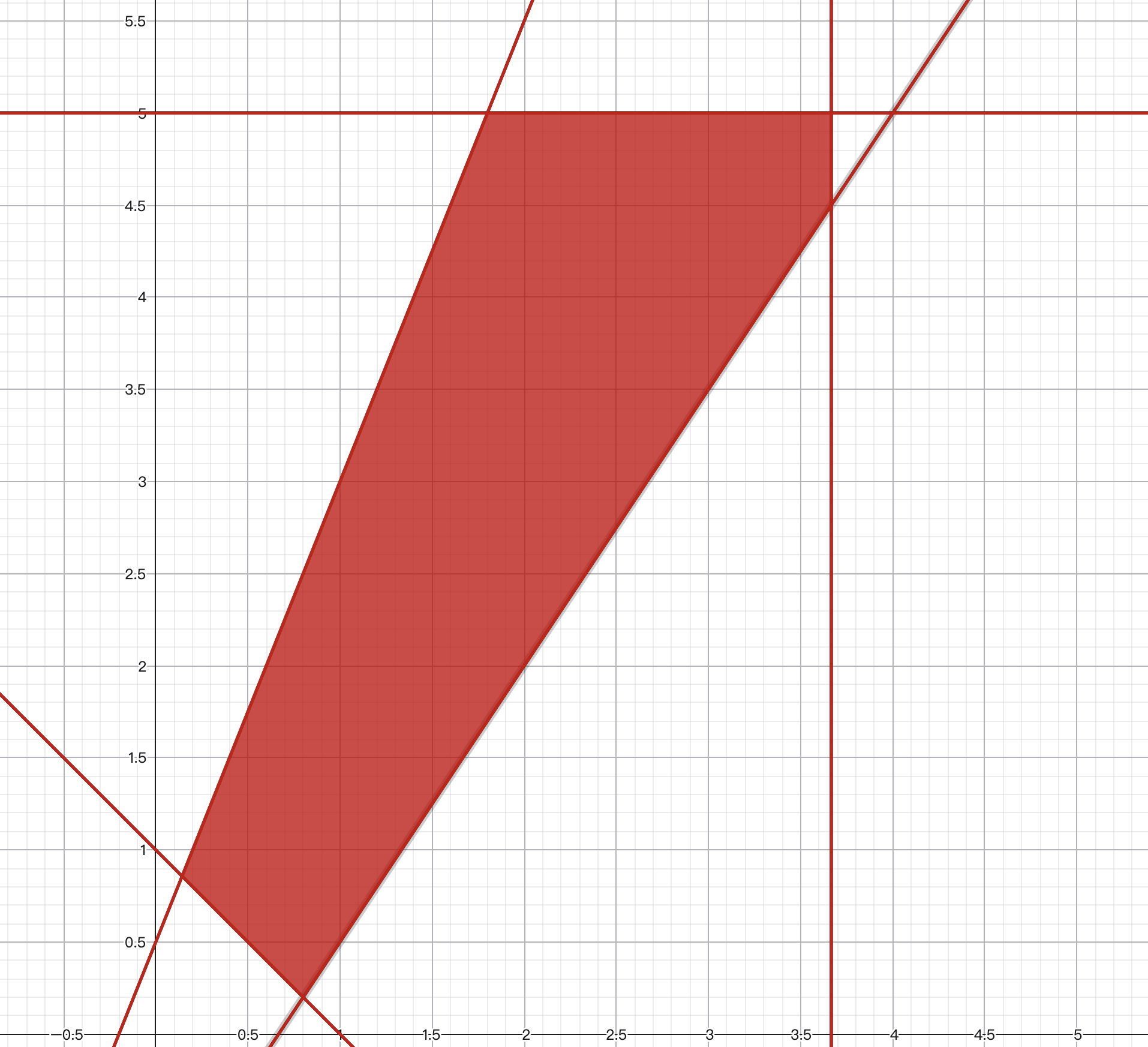 Then (1, 1) and (1.6, 1.8) is in the feasible region, since they satisfy all the constraints above. However, (2, 1.5) is not in the feasible region, as it doesn't satisfy the fifth constraint. The red area in the following picture shows the feasible region of these contraints.