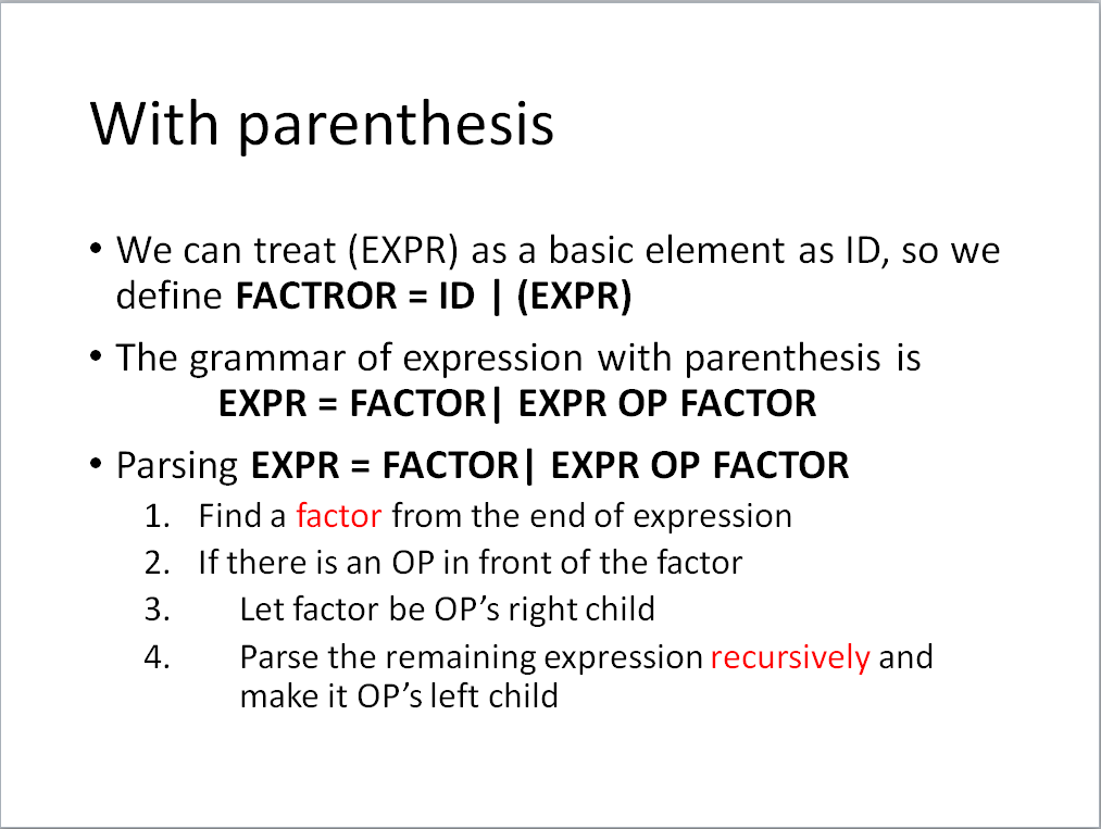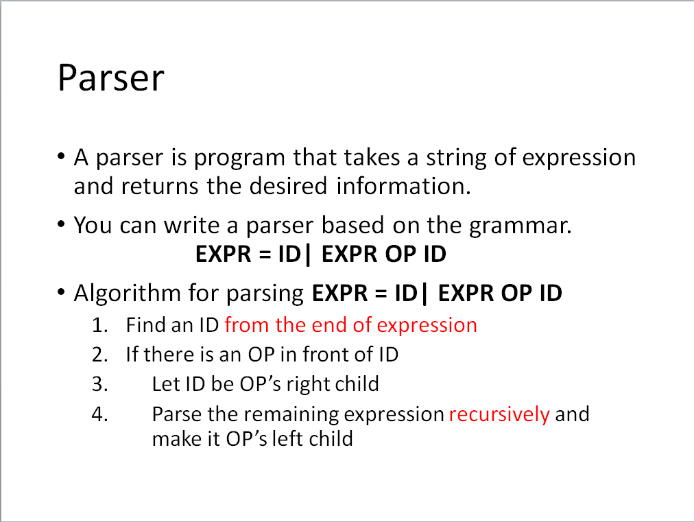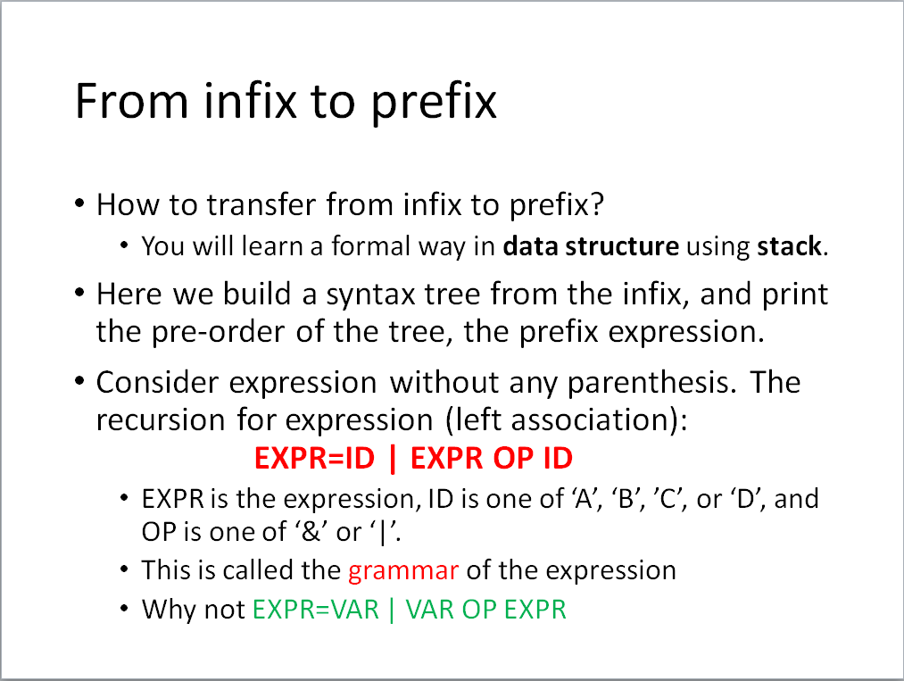 Hint: You can combine two homework. Build a syntax tree and print the infix expression with necessary parentheses.