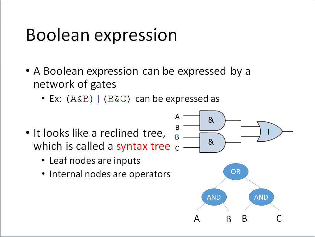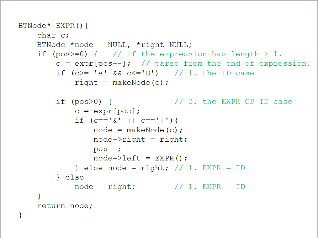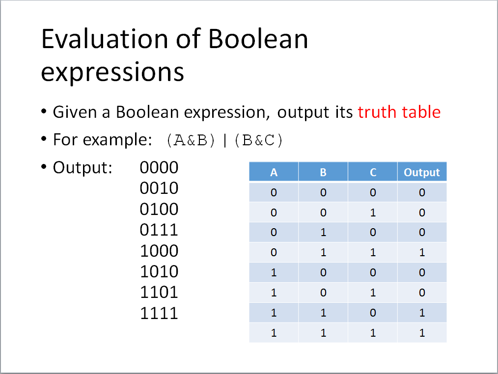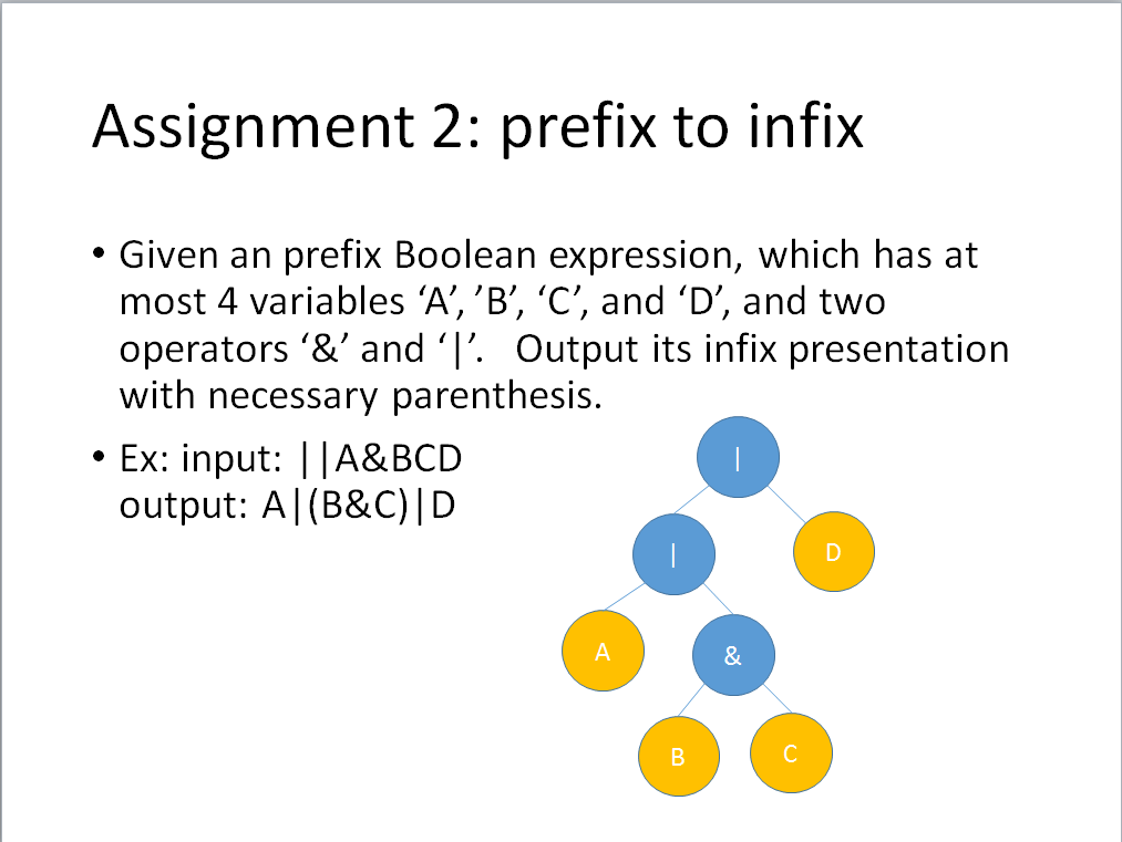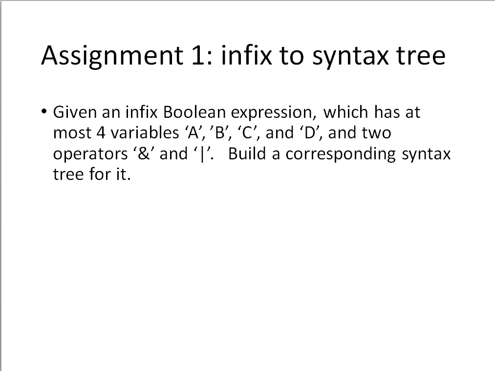 The input is an infix expression, which has at most 4 variables ‘A’, ’B’, ‘C’, and ‘D’, two operators ‘&’ and ‘|’, and parentheses. The length of the infix expression is less than 256.