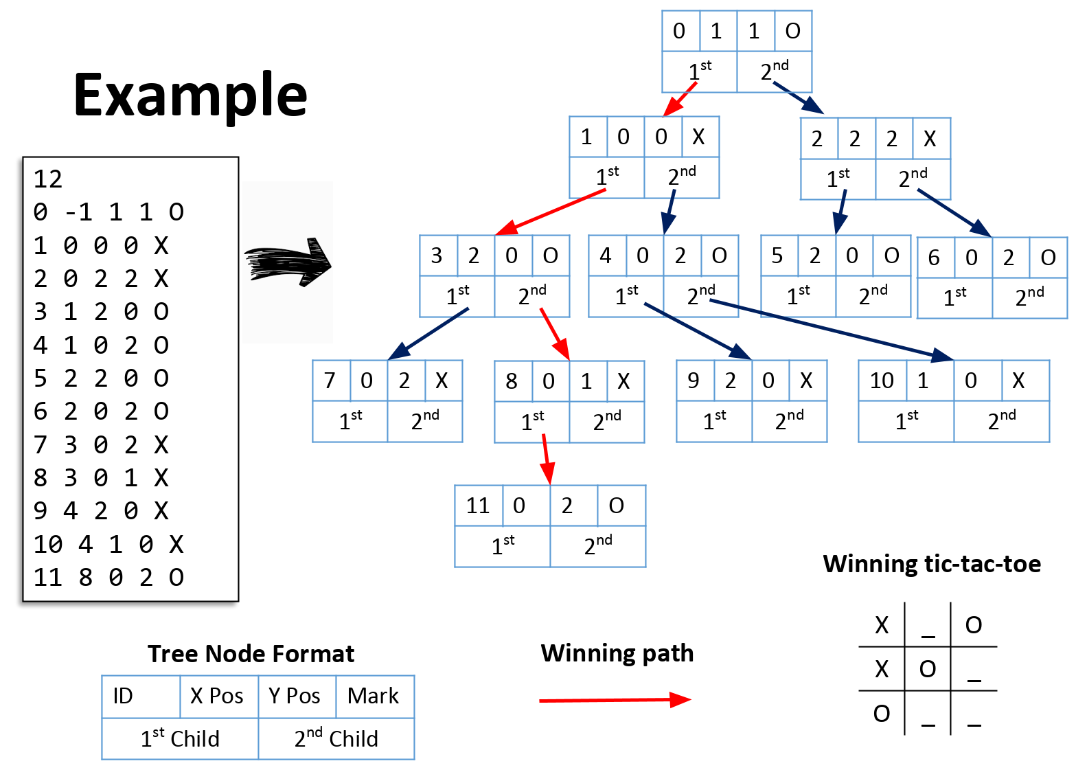 You will be first be given a list of nodes to insert into a tree. The resulting trees will not be balanced, complete nor full. After building the tree, you should traverse it and find wether there is a path with a 'winning' Tic-tac-toe game status. There will be either 1 or 0 'Winning' paths in a tree.