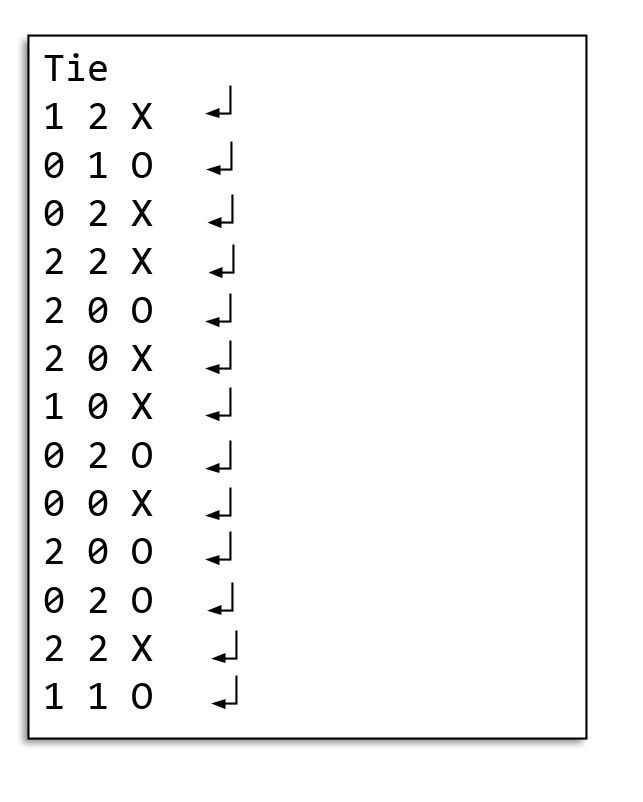 - Position x, position y and Mark{O, X}, separated by whitespaces, followed by new line