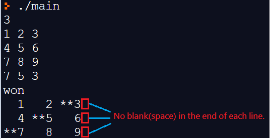 Your program will input an integer n in the range 0 to 99. This represents the number of rows and also the number of columns of the table. This is followed by n lines of integers, each line containing n integers. This represents the nxn table. Finally, there will be a sequence of integers in the range 0 to 99 followed by a -1 value, each value on a separate line. You may assume that the numbers in the sequence do not repeat and that the sequence of numbers will be ended (with a -1) as soon as a row, column or diagonal is completed. A sample input is given below.