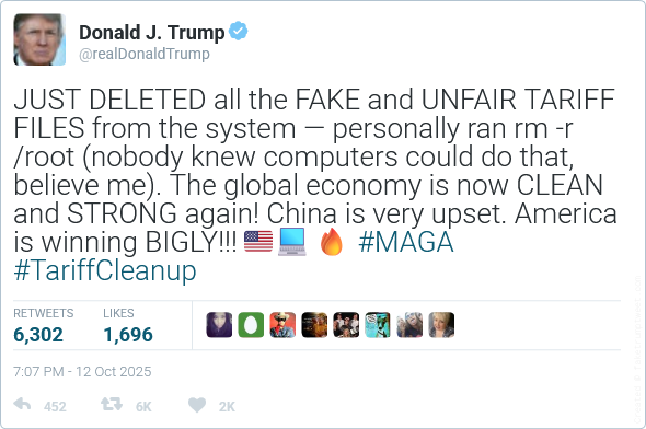 President Trump has once again taken matters into his own hands, this time, to “fix” the global economy by personally deleting every tariff policy ever made. Naturally, the policies are stored in a complicated nested folder system, because what’s more “simple” than thousands of trade files inside /root?