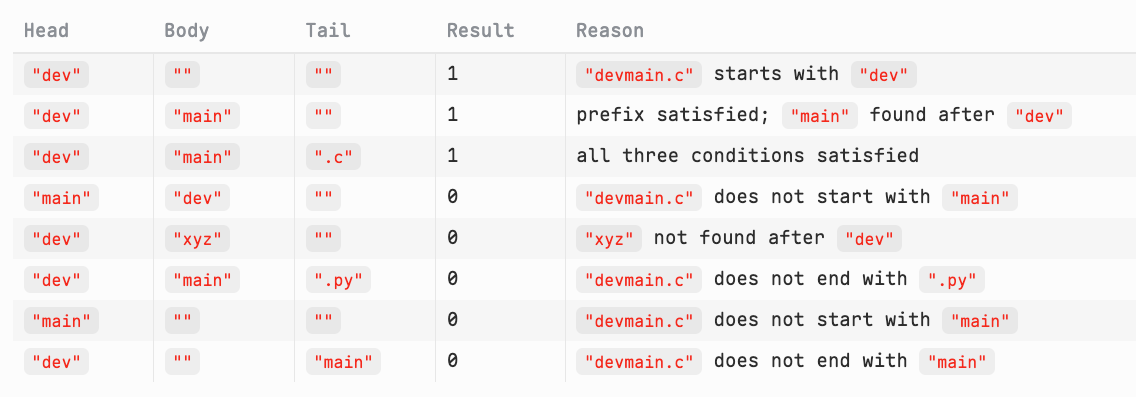 head is a prefix of filename.tail is a suffix of filename.body exists as a substring of filename, strictly after head and strictly before tail.If any of head, body, tail is an empty string "", skip the corresponding check.