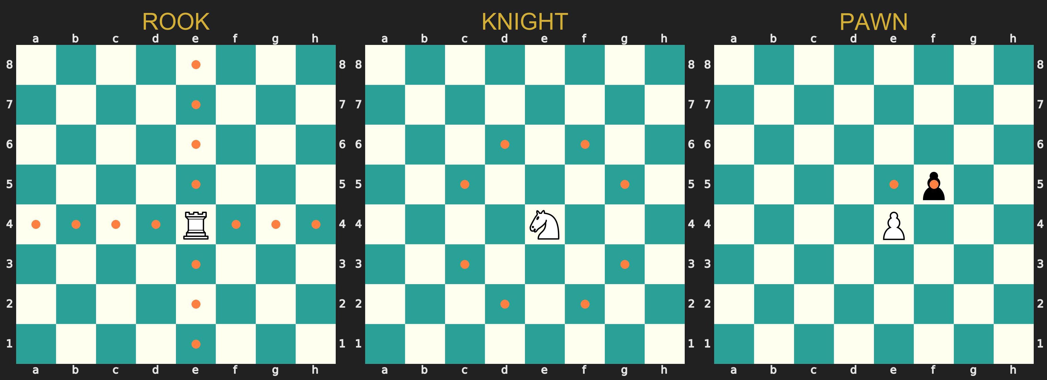 P (Pawn): Moves straight forward one vacant square, but captures diagonally one square forward. (Note: To keep things simple, pawns cannot make an initial two-square move, and pawn promotion is ignored in this challenge.)